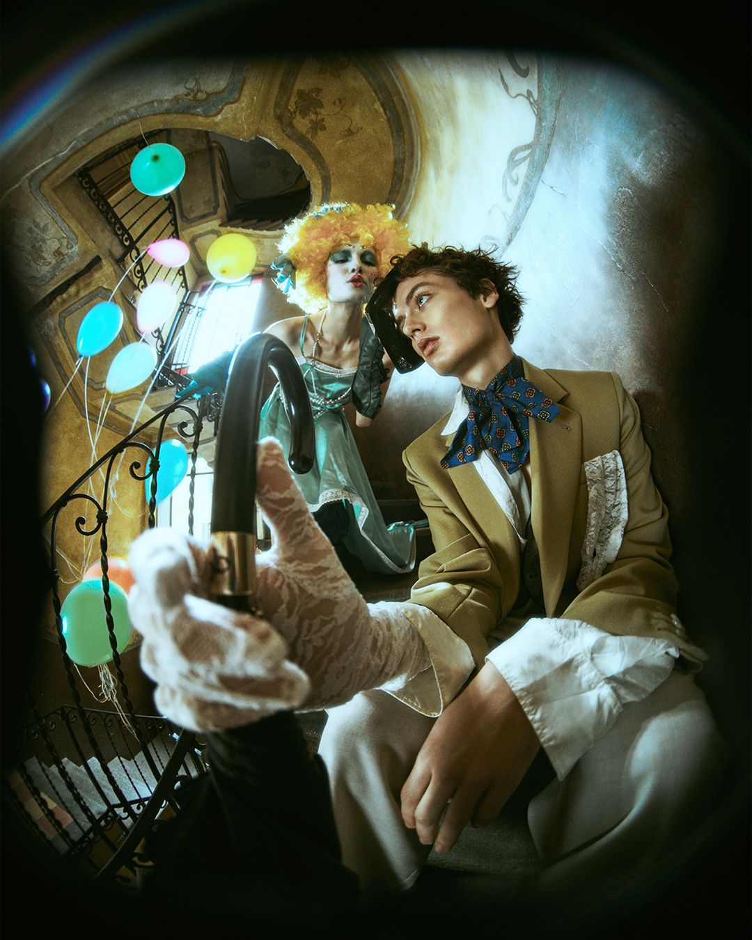 The voice of the narrator changes from male to female "Each balloon speaks, and these words come from a different world. In this space, green is another color. The novelist sits on the edge of a tree and gazes ahead. A blindfolded fairy holding a balloon approaches the novelist and whispers to him. Meanwhile the novelist said, "I need a chance to enter the world. The fairy hands the balloon to him.